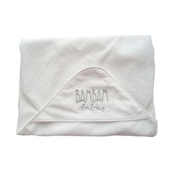 Prachtig zilveren baby omslagdoek met mutsje van het merk BamBam. Het is afgewerkt met een zilveren tekst op het mutsje.