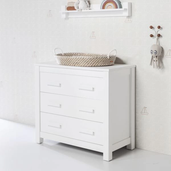 De Europe Baby Juno Commode Wit beschikt over drie handige opbergladen, Ideaal voor alle baby spulletjes! Laden zijn erg praktisch omdat je zo ook makkelijk bij de achterste spullen kunt. De rand op de commode zorgt ervoor dat het waskussen altijd netjes op z’n plaats blijft liggen. De commode voldoet aan de Europese veiligheidsnorm en is perfect te combineren met andere items uit de Juno serie.