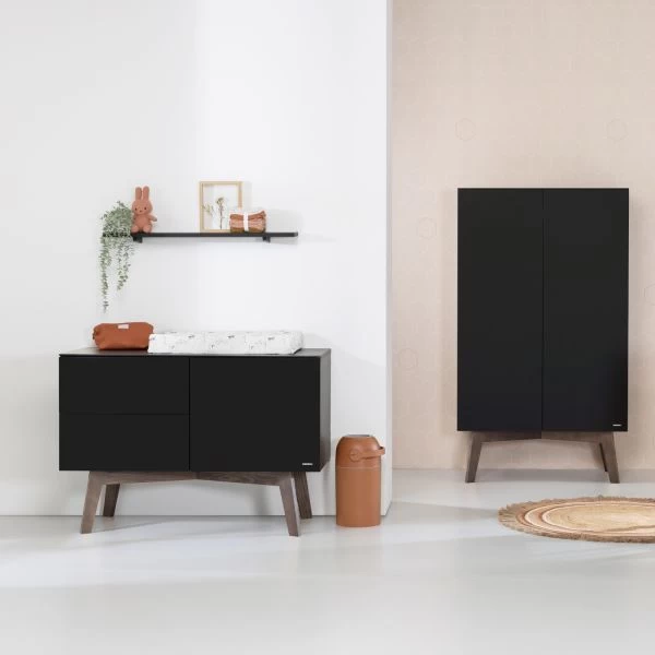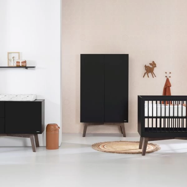 Met de Kidsmill Sixties Babykamer Zwart Mat / Walnoot haal je stijl en design in huis. De meubels van de Babykamer Sixties zijn strak en tot in de kleinste details afgewerkt. De zwarte delen zijn gemaakt van hoogwaardig MDF en plaatmateriaal en de pootjes zijn gemaakt van eikenhout. Alle bewegende delen zijn voorzien van het handige “Push open” systeem. Bij het ledikant wordt een peuterzijde meegeleverd. Met deze zijde kan je kindje (als het oud genoeg is) zelfstandig en veilig uit het ledikantje klimmen.