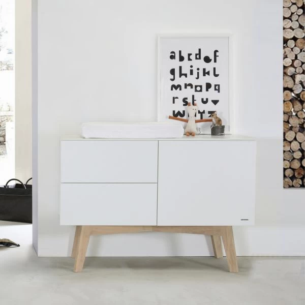 De Kidsmill Sixties Commode is stijlvol en beschikt over veel opbergruimte. Dankzij het grote commode blad kun je jouw kindje gemakkelijk en comfortabel verschonen. De laden zijn voorzien van het handige “Push open” systeem. De Sixties commode is gemaakt van hoogwaardig MDF en plaatmateriaal. De blanke pootjes zijn gemaakt van eikenhout.