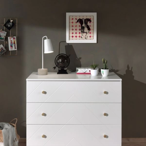 De Vipack Billy Commode Wit is gemaakt van hoogwaardig materiaal. De commode beschikt over 3 lades met voldoende opbergruimte. Dankzij de eenvoudige vormen en kleuren is de Vipack Billy Commode geschikt voor in elke kamer. De diagonale strepen en de gouden handgreepjes en pootjes zijn kenmerkend voor de Billy collectie. De commode is perfect te combineren met andere producten van de Billy collectie.